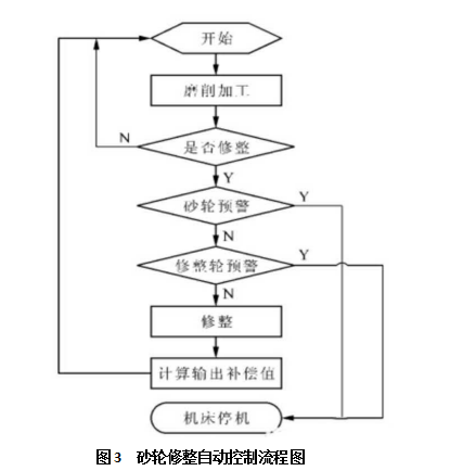 在磨削加工中,砂輪的磨損狀態是影響磨削質量的一個重要因素。該數控工具磨床可在刀片加工磨削的全過程中對砂輪狀態進行實時監測。根據加工刀片尺寸和材料的不同,需要磨削去除的體積和磨削時間也不同。綜合考慮各個因素,設定自動修整的間隔。通過對砂輪磨削刀片次數計數,并實時的將其與系統設定的修整間隔比較。當磨削次數達到設定的修整間隔次數時,在 NC 程序中自動調用修整模塊,實現砂輪的自動修整。為了保證機床運行安全,該控制方法還加入了對砂輪壽命和修整輪壽命的實時監控。只要檢測到本次修整將可能導致砂輪或修整輪到達預警厚度,機床將自動發出報警信號,停機等待人工處理。如果砂輪和修整輪均未到達報警厚度,則修整順利進行。修整結束后,通過數據處理,輸出砂輪修整后的補償值。砂輪修整自動控制流程如圖 3 所示