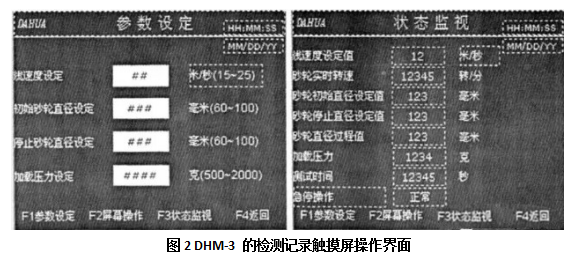 圖2是DHM-3的柱測記錄觸摸屏操作界面。通過該界面可以錕方便地蔣需要的工作參數錄^;通過狀態監視界面可以實時地觀測、查詢檢測數據。