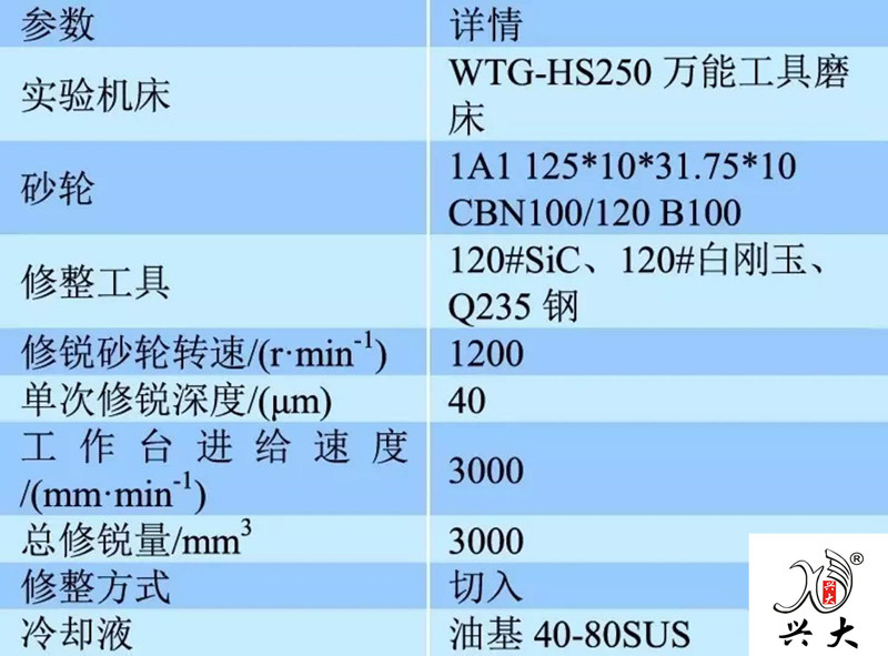 圖2 為樹脂結合劑CBN砂輪修銳試驗圖,在WTG-HS250數控萬能工具磨床上進行砂輪修銳試驗。把修整工具固定到工作臺上進行平面磨削修銳,為消除上次修銳結果的干擾,在每次修銳前均采用同粒度的陶瓷金剛石工具進行整形,首先去除一定量的砂輪表面,直到砂輪圓周跳動<3μm為止,然后分別采用碳化硅、白剛玉和Q235鋼對100/120樹脂結合劑CBN進行修銳,修銳條件如表1所示,三種修銳工具材料硬度與CBN磨料硬度對比見表2。