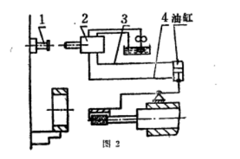 圖2是內圓磨砂輪主軸可在砂輪進入工件內孔進行磨削時防護罩自動抬起,在砂輪退出后防護罩自動下落將砂輪罩住的液壓系統控制的防護罩示意圖:液壓開關2與砂輪架一起向左運動,碰塊1頂開液壓開關2壓力油自油路3進入油缸上方,油路4與回油路接通,砂輪防護罩抬起,砂輪罩向右運動,液壓開關2離開碰塊1壓力油從路4進入油缸下部,砂輪罩將砂輪罩住。