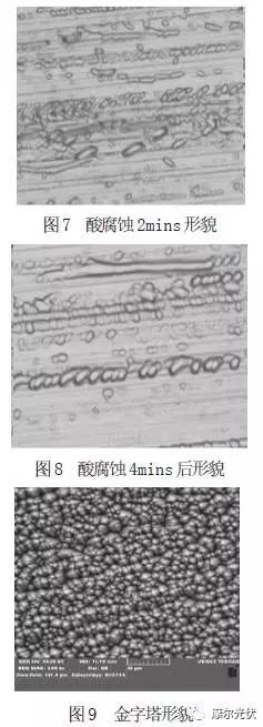 嘗試在酸腐蝕體系 HF 17% - HNO3 50% (體積濃度),溫度7~ 9℃,反應時間 2mins、4mins,目的優先腐蝕該金剛石線單晶切片表面斷裂損傷處,水洗后在單晶常規堿制絨體系中進行金字塔生長(如圖 7,8,9)。