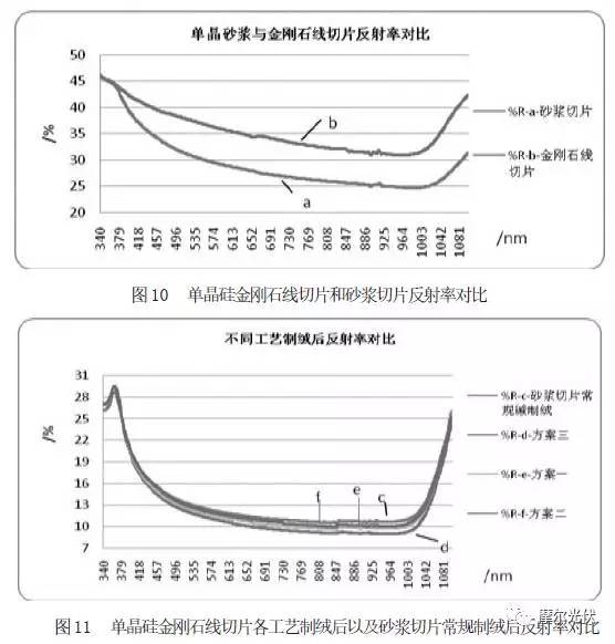 對各工藝制絨后硅片用HITACH公司的D- 4100 球型積分測試儀測試反射率(如圖 11),結果證明方案三反射率最低。