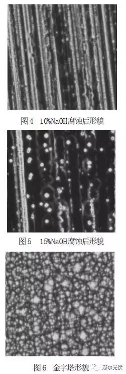 第一種用質量濃度約 8% NaOH,溫度 65℃堿腐蝕液粗拋 3mins后用去離子水沖洗(如圖 4);第二種用質量濃度約12% NaOH,溫度65℃堿腐蝕液粗拋 8mins 用去離子水沖洗后再進行常規堿制絨(如圖)