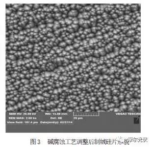 目的在不影響生產產量的情況下提高金剛石線切片的腐蝕速率以有效去掉硅片表面損傷層,并能形成大小良好、成核密度良好的金字塔(如圖 3)。其表面線痕仍較明顯。